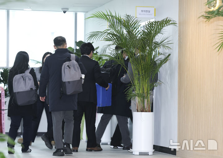 [서울=뉴시스] 김근수 기자 = 19일 오후 서울 동작구의회 사무처에서 서울경찰청 광역수사단 수사관들이 압수물품을 들고 이동하고 있다.