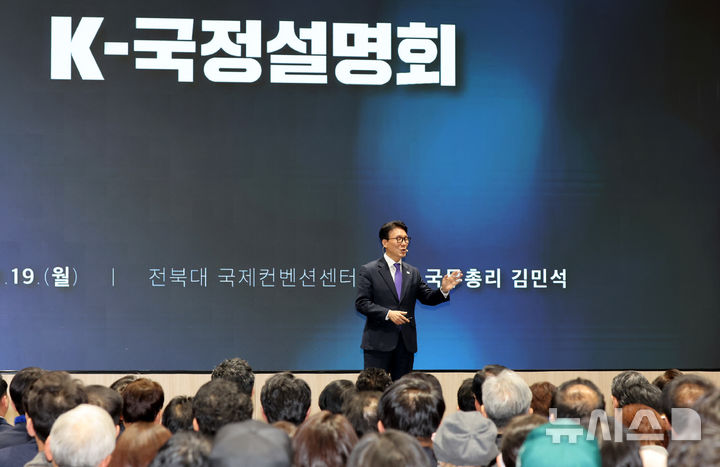 [전주=뉴시스] 김얼 기자 = 김민석 국무총리가 19일 전북 전주시 전북대학교 국제컨벤션센터에서 열린 'K-국정설명회'에 참석해 특별강연을 하고 있다. (전북사진기자단 공동취재) 2026.01.19. [email protected]