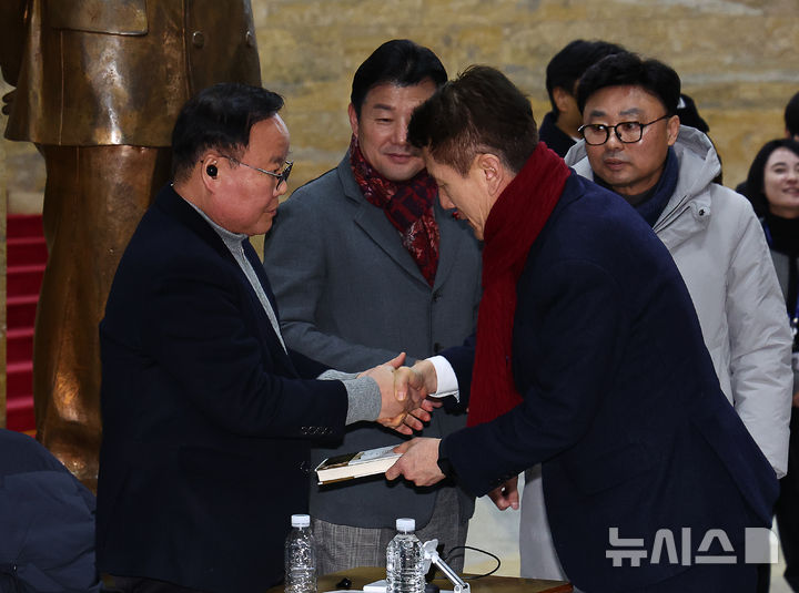 [서울=뉴시스] 김명년 기자 = 이강덕 포항시장이 20일 오후 서울 여의도 국회 로텐더홀에서 장동혁 국민의힘 대표와 함께 단식농성중인 김재원 최고위원과 인사하고 있다. 2026.01.20. [email protected]