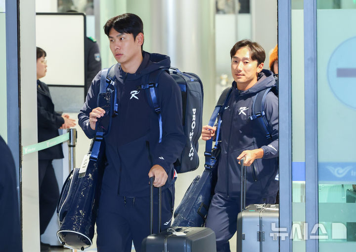 [인천공항=뉴시스] 황준선 기자 = 2026 월드 베이스볼 클래식(WBC)에 출전하는 대한민국 야구 국가대표팀 신민재(오른쪽)와 홍창기가 20일 밤 사이판에서 전지훈련을 마치고 인천국제공항 1터미널을 통해 귀국하고 있다. 2026.01.20. [email protected]