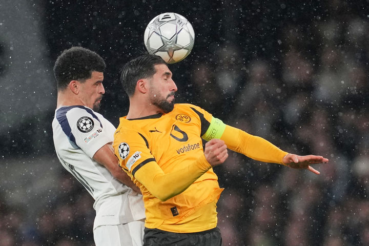 [런던=AP/뉴시스] 토트넘 홋스퍼의 도미닉 솔란케(왼쪽)가 20일(현지 시간) 영국 런던의 토트넘 홋스퍼 스타디움에서 열린 2025-26 유럽축구연맹(UEFA) 챔피언스리그(UCL) 리그 페이즈 7차전 보루시아 도르트문트(독일)와 경기 중 공중 볼을 다투고 있다. 토트넘이 2-0으로 승리하고 UCL 5위로 올라섰다. 2026.01.21.