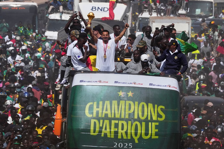 [다카르=AP/뉴시스] 세네갈 축구 국가대표 선수들이 20일(현지 시간) 세네갈 다카르에서 수천 명의 팬이 환호하는 가운데 2025 아프리카 네이션스컵(AFCON) 우승 자축 퍼레이드를 펼치고 있다. 세네갈은 지난 18일 모로코에서 열린 AFCON 결승에서 개최국 모로코를 연장 끝에 1-0으로 꺾고 4년 만에 우승했다. 2026.01.21.