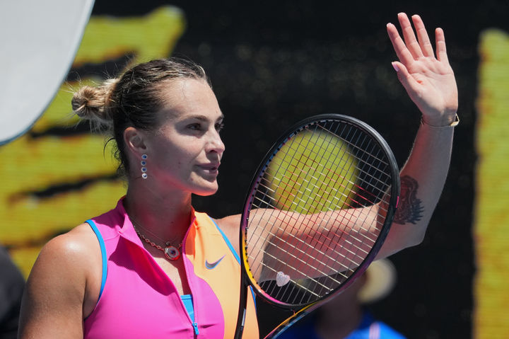 [멜버른=AP/뉴시스] 아리나 사발렌카(1위·벨라루스)가 21일(현지 시간) 호주 멜버른에서 열린 호주오픈 여자 단식 2회전에서 바이 주오슈안(702위·중국)을 꺾은 뒤 팬들에게 인사하고 있다. 사발렌카가 2-0(6-3 6-1)으로 승리하고 3회전(32강)에 올랐다. 2026.01.21.