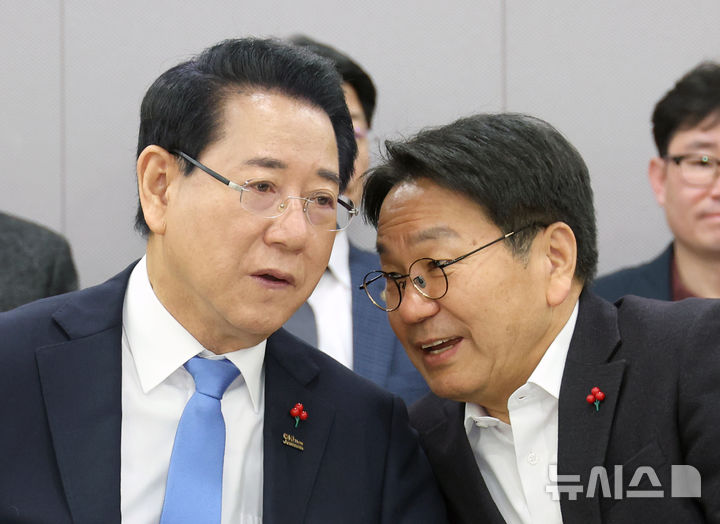 [서울=뉴시스] 김금보 기자 = 김영록(왼쪽) 전남도지사와 강기정 광주광역시장이 21일 서울 여의도 국회 의원회관에서 열린 더불어민주당 광주전남 의원 행정통합 관련 조찬 간담회에서 논의를 하고 있다. 2026.01.21. [email protected]
