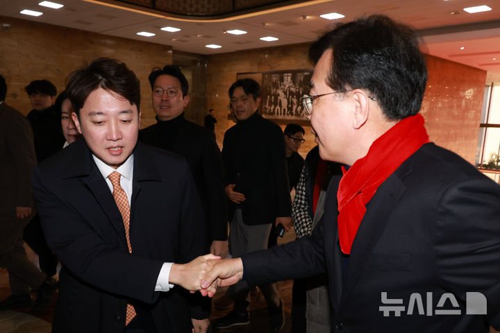 [서울=뉴시스] 고승민 기자 = 이준석 개혁신당 대표가 21일 서울 여의도 국회 로텐더홀에서 이레째 단식농성 중인 장동혁 국민의힘 대표를 예방하기 전 송언석 원내대표를 만나 인사하고 있다. 2026.01.21. [email protected]