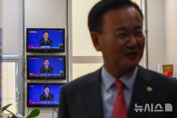 [서울=뉴시스] 김명년 기자 = 21일 오전 서울 여의도 국회 국민의힘 원내대표실에서 유상범 원내운영수석부대표 뒤로 이재명 대통령 신년 기자회견 장면이 화면에 나오고 있다. 2026.01.21. [email protected]