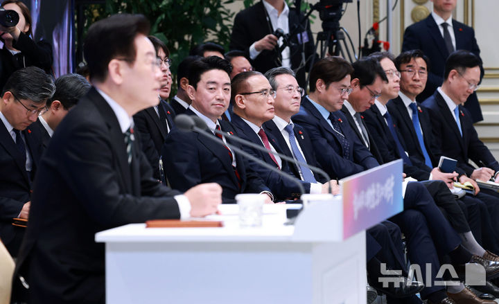 [서울=뉴시스] 고범준 기자 = 21일 청와대 영빈관에서 열린 이재명 대통령 2026년 신년 기자회견에서 강훈식 비서실장을 비롯한 참모진이 이 대통령 발언을 듣고 있다.