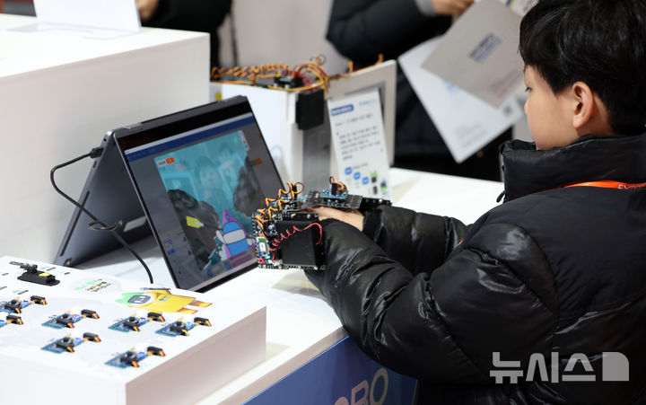 [서울=뉴시스] 이영환 기자 = 21일 서울 강남구 코엑스에서 열린 제23회 대한민국 교육박람회에서 한 어린이가 로보로보 부스에서 피지컬AI 체험을 하고 있다. 2026.01.21. [email protected]
