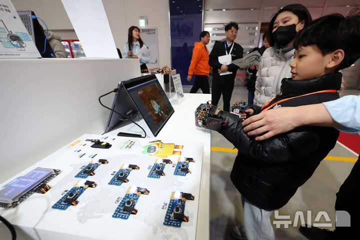 [서울=뉴시스] 이영환 기자 = 21일 서울 강남구 코엑스에서 열린 제23회 대한민국 교육박람회에서 한 어린이가 로보로보 부스에서 피지컬AI 체험을 하고 있다. 2026.01.21. [email protected]