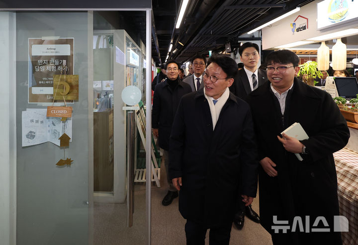 [서울=뉴시스] 김선웅 기자 = 김민석 국무총리가 21일 서울 동대문구 경동시장 청년몰에 '문화가 있는 전통시장' 간담회 참석차 방문해 입점업체를 둘러보고 있다. 2026.01.21. [email protected]