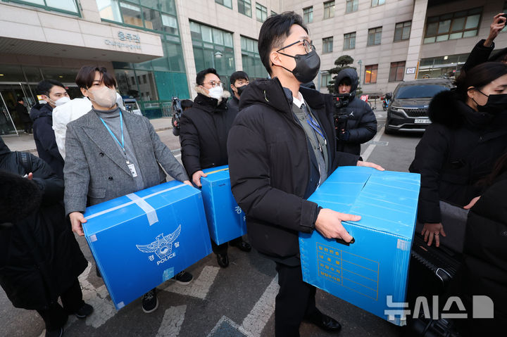 [서울=뉴시스] 황준선 기자 = 21일 군경합동조사TF가 올해 초 무인기를 만들어 북한에 날려 보냈다는 의혹을 받는 민간인 피의자들에 대한 3명의 주거지 및 사무실 등에 대해 압수수색에 돌입했다. 이날 피의자와 관련된 서울 시내 한 대학교에서 압수수색을 마친 관계자들이 압수품을 들고 나서고 있다. 2026.01.21. [email protected]
