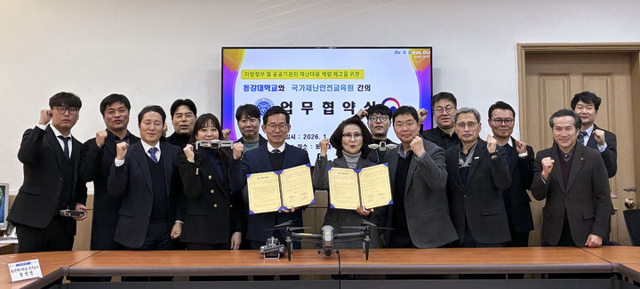 [세종=뉴시스] 강종민 기자 = 문영훈 행정안전부 국가재난안전교육원장(왼쪽)과 이민숙 동강대학교 총장이 21일 오후 광주광역시 동강대학교에서 열린 ‘드론을 활용한 재난안전 교육 발전을 위한 업무협약’ 체결식 후 참석자들과 기념촬영을 하고 있다. (사진=행안부 제공) 2026.01.21. [email protected] *재판매 및 DB 금지