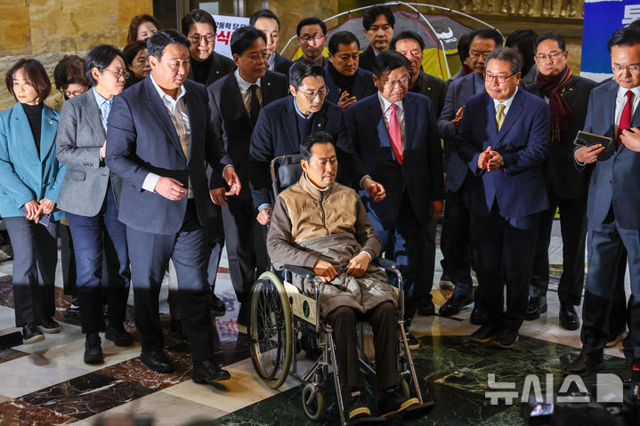 [서울=뉴시스] 김명년 기자 = 장동혁 국민의힘 대표가 22일 서울 여의도 국회에서 통일교·공천헌금 '쌍특검' 수용 촉구 단식을 마치고 병원 이송을 위해 휠체어를 타고 의원들의 박수를 받으며 이동하고 있다. 2026.01.22. [email protected]