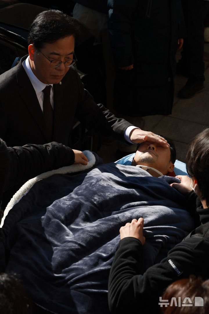 [서울=뉴시스] 고승민 기자 = 여드레째 단식농성을 이어 온 장동혁 국민의힘 대표가 22일 서울 여의도 국회에서 병원으로 이송되고 있다. 송언석 원내대표 등이 햇빛을 가려주고 있다. 2026.01.22. [email protected]