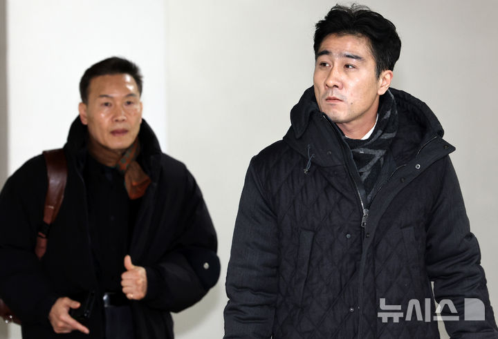 [서울=뉴시스] 이영환 기자 = 채상병특검 '구명로비 위증' 혐의로 재판에 넘겨진 이관형(오른쪽)씨와 송호종씨가 22일 오후 서울 서초구 서울중앙지법에서 열린 1차 공판에 출석하고 있다. 2026.01.22. [email protected]