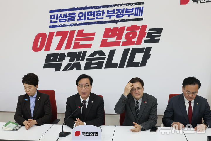 [서울=뉴시스] 조성봉 기자 = 송언석 국민의힘 원내대표가 22일 오후 서울 여의도 국회에서 홍익표 대통령비서실 정무수석을 접견하며 인사말을 하고 있다. 왼쪽부터 김은혜 원내정책수석부대표, 송 원내대표, 홍 정무수석, 유상범 원내운영수석부대표. 2026.01.22. [email protected]