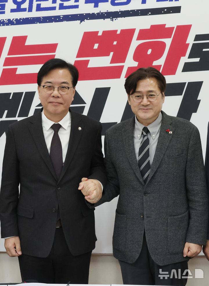 [서울=뉴시스] 조성봉 기자 = 송언석 국민의힘 원내대표가 22일 오후 서울 여의도 국회에서 홍익표 대통령비서실 정무수석을 접견하며 악수를 하고 있다. 2026.01.22. [email protected]