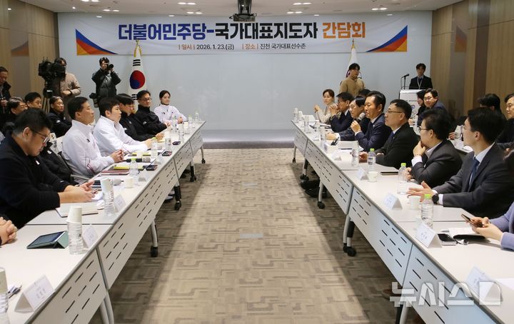 [진천=뉴시스] 서주영 기자 = 23일 충북 진천국가대표선수촌에서 정청래 더불어민주당 대표와 최고위원들이 국가대표지도자들과 간담회를 하고 있다. 2026.01.23. [email protected]
