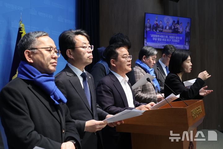 [서울=뉴시스] 조성봉 기자 =  민병덕 더불어민주당 을지로위원장이 23일 오전 서울 여의도 국회 소통관에서 열린 '쿠팡 명절 휴업 촉구 및 생활물류서비스법 개정안 발의 공동 기자회견'에서 발언을 하고 있다. 2026.01.23.  [email protected]