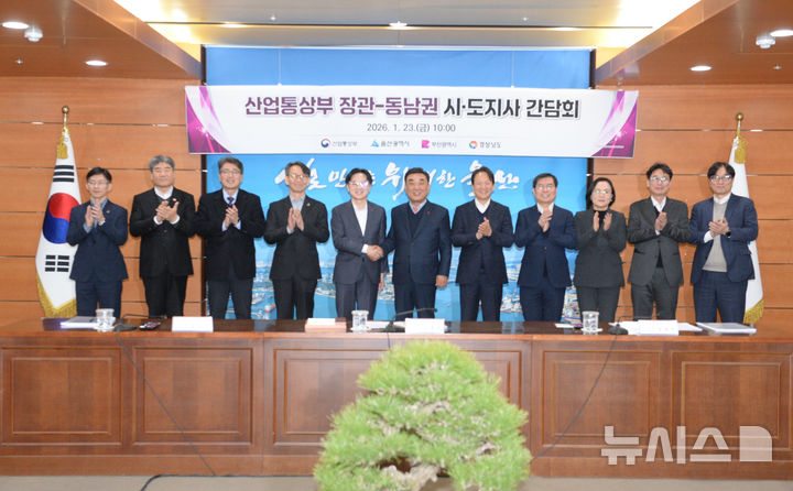 [울산=뉴시스] 배병수 기자 = 23일 울산시청 7층 상황실에서 열린 산업부-동남권 시도지사 현안 간담회에 앞서 김정관(왼쪽 다섯번째) 산업부 장관, 김두겸(왼쪽 여섯번째) 울산시장 등 참석자들이 기념촬영을 하고 있다. 2026.01.23. [email protected].