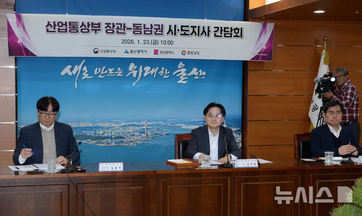 [울산=뉴시스] 배병수 기자 = 김정관(가운데) 산업통상부 장관이 23일 울산시청 7층 상황실에서 열린 산업부-동남권 시도지사 현안 간담회에서 모두 발언을 하고 있다. 2026.01.23. [email protected].