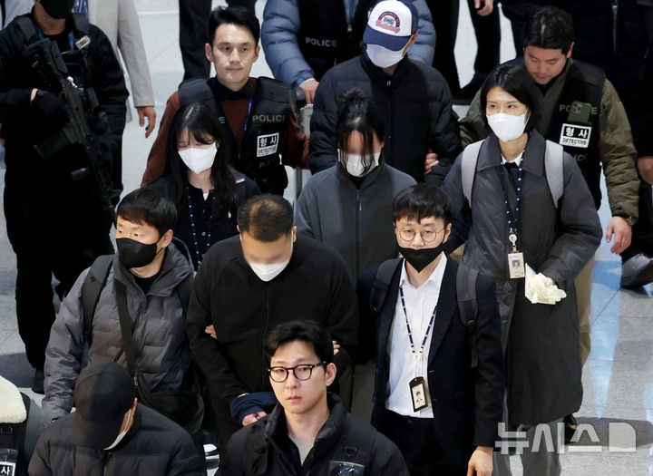 [인천공항=뉴시스] 김진아 기자 = 캄보디아에서 연애를 빙자한 사기 일명 '로맨스스캠'으로 120억원을 가로챈 한국인 총책 부부가 23일 오전 인천국제공항 제2터미널을 통해 한국 국적 캄보디아 스캠조직 피의자들과 강제 송환되고 있다.