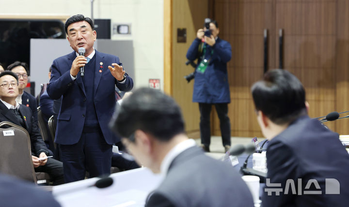 [울산=뉴시스] 최동준 기자 = 김두겸 울산시장이 23일 울산전시컨벤션센터에서 열린 이재명 대통령 주재 '울산의 마음을 듣다' 타운홀 미팅에서 발언하고 있다. (청와대통신사진기자단) 2026.01.23. [email protected]