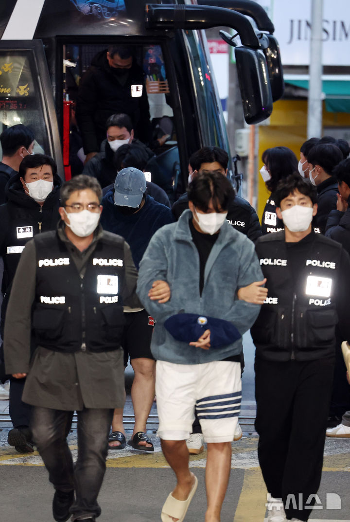 [부산=뉴시스] 하경민 기자 = 캄보디아 범죄단체에 가담한 혐의로 강제송환된 한국인 조직원 일부가 23일 부산 동래구 동래경찰서로 압송되고 있다.