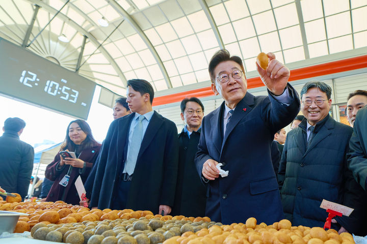 [서울=뉴시스] 최동준 기자 = 이재명 대통령이 23일 울산 울주군 남창옹기종기시장을 방문해 온누리 상품권으로 먹거리를 구매하고 있다. (사진=청와대 제공) 2026.01.23. [email protected] *재판매 및 DB 금지