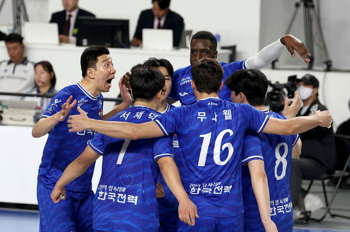 [서울=뉴시스] 23일 수원실내체육관에서 열린 진에어 2025-26 프로배구 V-리그 한국전력과 현대캐피탈의 경기에서 한국전력 선수들이 환호하고 있다. (사진=한국전력 배구단 제공). 2026.01.23. [email protected] *재판매 및 DB 금지