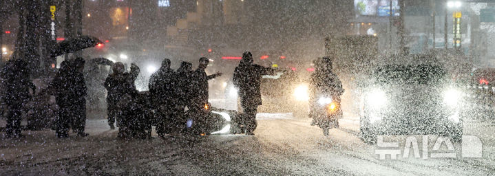 [서울=뉴시스] 박주성 기자 = 서울에 눈이 내린 23일 오후 서울 중구 인근에서 오토바이 한대가 눈길에 넘어져 시민들이 오토바이 운전자를 도와주러 모이고 있다. 2026.01.23. [email protected]