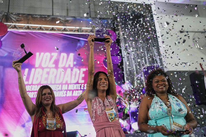 [리우데자네이루=AP/뉴시스] 23일(현지 시간) 브라질 리우데자네이루의 한 여성 교도소에서 재활 프로그램으로 열린 ‘보이스 오브 프리덤’ 노래 경연 대회에서 우승한 페르난다(가운데)가 트로피를 들고 기뻐하고 있다. 2026.01.24.