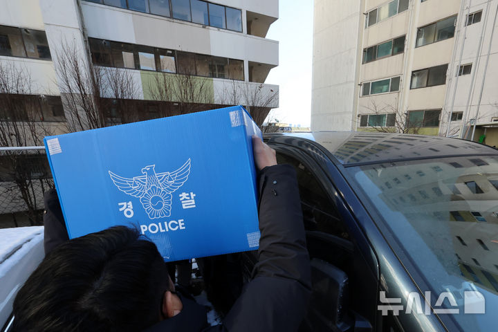 [서울=뉴시스] 조성우 기자 = 경찰이 서울시 선거관리위원회로부터 이첩받은 김경 서울시의원의 공천 로비 의혹 사건과 관련해 24일 오후 서울 강서구 화곡동 김 의원 자택 압수수색을 마친 뒤 압수물품을 옮기고 있다. 2026.01.24. [email protected]