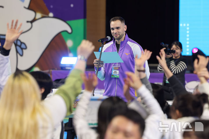 [춘천=뉴시스] 권창회 기자 = 24일 강원 춘천시 호반체육관에서 열린 진에어 2025~2026 V-리그 올스타전 사전행사에서 올스타 비예나가 팬들과 게임을 하고 있다. 2026.01.24. [email protected]