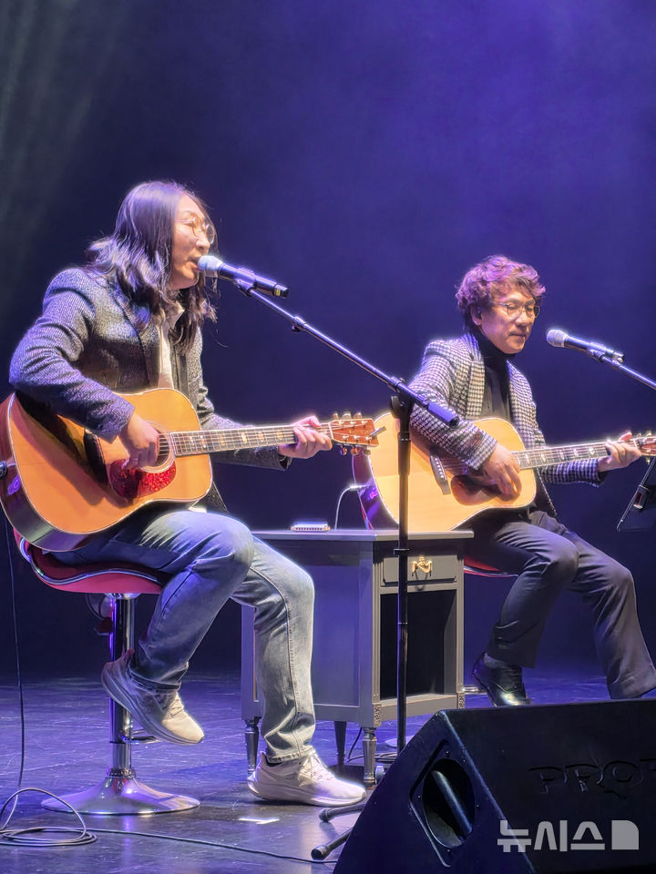 [대구=뉴시스] 포크 뮤지션 배재혁(왼쪽)과 허만성이 24일 대구시 북구 어울아트센터에서 열린 '두 남자의 통기타 이야기' 콘서트에서 공연하고 있다. 2026.01.24 [email protected]
