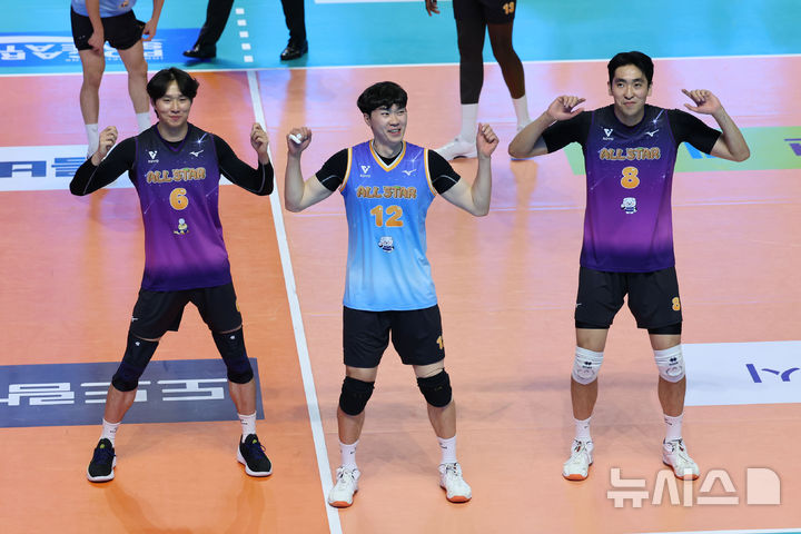 [춘천=뉴시스] 권창회 기자 = 25일 강원 춘천시 호반체육관에서 열린 진에어 2025~2026 V-리그 올스타전에서 K-스타 전광인이 춤을 추고 있다. 2026.01.25. [email protected]