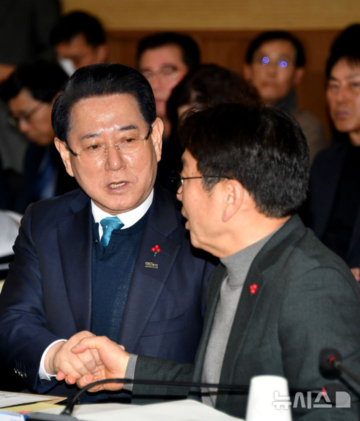 [광주=뉴시스] 변재훈 기자 = 김영록 전남도지사(사진 왼쪽)가 25일 광주 서구 김대중컨벤션센터 회의실에서 열린 광주·전남 행정통합 특별법 제정 간담회에 참석해 인사말을 마친 직후 강기정 광주시장에게 악수를 청하고 있다. 2026.01.25. [email protected]