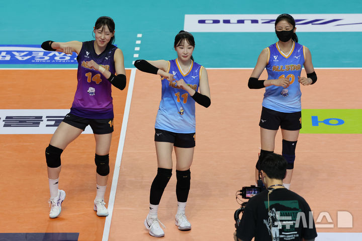 [춘천=뉴시스] 권창회 기자 = 25일 강원 춘천시 호반체육관에서 열린 진에어 2025~2026 V-리그 올스타전에서 K-스타 최서현과 이선우, 박혜민이 춤을 추고 있다. 2026.01.25. [email protected]
