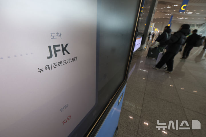 [인천공항=뉴시스] 김근수 기자 = 미국 동부 지역에 발생한 겨울폭풍으로 비상사태가 선포돼 항공편이 다수 취소되는 가운데 26일 인천 중구 인천국제공항 제2여객터미널 국제선 출국장 안내현황에 뉴욕행 비행편 지연 운항 관련 안내문구가 나오고 있다. 2026.01.26. [email protected]미