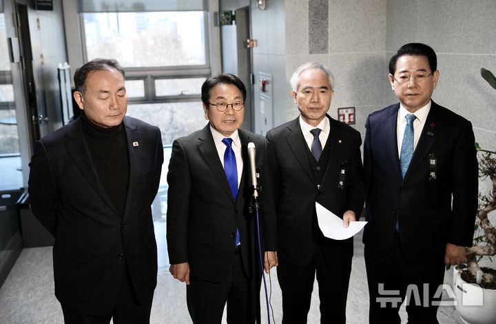 [서울=뉴시스] 광주·전남 행정통합 특별법안 검토를 위한 시·도지사와 국회의원 제4차 간담회가 27일 서울 국회에서 열린 가운데 김원이(왼쪽부터) 민주당 전남도당위원장, 강기정 광주시장, 양부남 민주당 광주광역시당위원장, 김영록 전남도지사가 언론 브리핑을 하고있다. (사진=광주시 제공) 2026.01.27 [email protected]