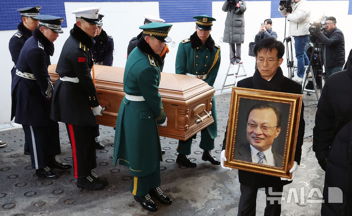 [서울=뉴시스] 조성우 기자 = 베트남 출장 중 별세한 고(故) 이해찬 민주평화통일자문회의 수석부의장의 시신과 영정이 27일 오전 서울 종로구 서울대학교병원 장례식장에 도착해 운구되고 있다. 2026.01.27. [email protected]