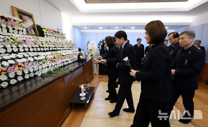 [서울=뉴시스] 사진공동취재단 = 김재연 진보당 상임대표와 윤종오 원내대표가 27일 서울 종로구 서울대학교병원 장례식장에 마련된 이해찬 민주평화통일자문회의 수석부의장 빈소에서 조문하고 있다. 2026.01.27. [email protected]