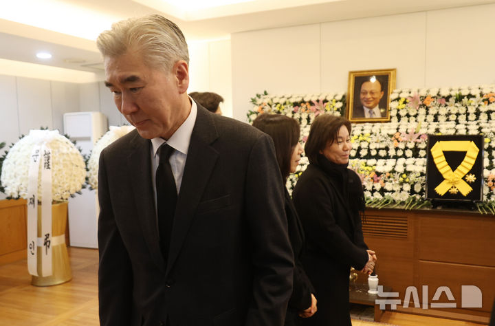 [서울=뉴시스] 사진공동취재단 = 성 김 현대자동차그룹 전략기획담당 사장이 27일 서울 종로구 서울대학교병원 장례식장에 마련된 이해찬 민주평화통일자문회의 수석부의장 빈소에서 조문하고 있다. 2026.01.27. [email protected]