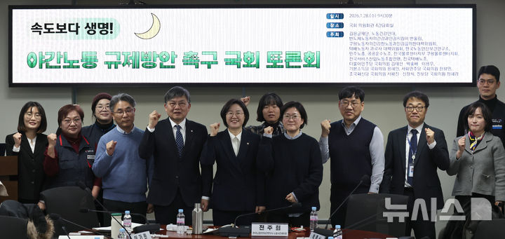 [서울=뉴시스] 김금보 기자 = 정혜경 진보당 의원을 비롯한 사회 노동 시민단체 참석자들이 28일 오전 서울 여의도 국회 의원회관에서 열린 '야간노동 규제방안 촉구 국회 토론회'에서 기념촬영을 하고 있다. 2026.01.28. [email protected]