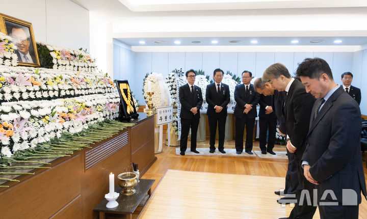 [서울=뉴시스] 황준선 기자 = 염영남(오른쪽 두 번째) 뉴시스 대표이사와 박상권(오른쪽 첫 번째) 뉴시스 편집국장이 28일 오전 서울 종로구 서울대학교병원 장례식장에 마련된 고(故) 이해찬 전 국무총리의 빈소를 조문하고 있다. 2026.01.28. [email protected]