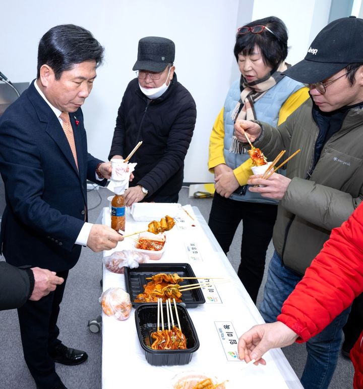 [제천=뉴시스] 이병찬 기자 = 김창규(왼쪽) 충북 제천시장이 29일 제천 어반케어센터에서 열린 제천빨간오뎅 맛 개선 품평회에서 출품한 빨간오뎅을 맛보고 있다.(사진=제천시 제공)[email protected]