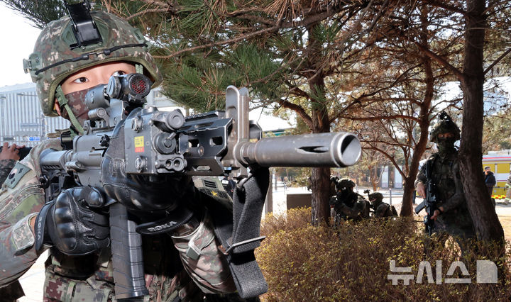 [세종=뉴시스] 강종민 기자 = 육군 32사단 특수임무대원들이 29일 세종시 어진동 정부세종청사 인근에서 열린 지하공동구 폭발 및 화재 등 국가중요시설 통합 방호훈련에서 지하공동구 투입에 앞서 사주경계를 하고 있다. 2026.01.29. [email protected]