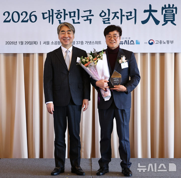 [서울=뉴시스] 최진석 기자 = 염영남 뉴시스 대표이사 사장이 29일 서울 중구 롯데호텔에서 뉴시스 주최로 열린 2026 대한민국 일자리대상 시상식에서 장용석 인천국제공항보안 본부장에게 대상 국회 행정안전위원장상을 수여 후 기념촬영하고 있다. 2026.01.29. [email protected]