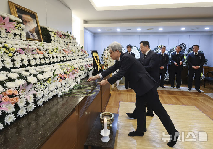 [서울=뉴시스] 사진공동취재단 = 김상환 헌법재판소장이 29일 오후 서울 종로구 서울대학교병원 장례식장에 마련된 故 이해찬 전 국무총리의 빈소에서 조문을 하고 있다. 2026.01.29. [email protected]