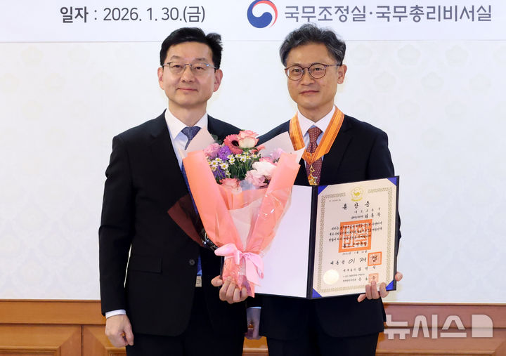 [서울=뉴시스] 추상철 기자 = 윤창렬 국무조정실장이 30일 오전 서울 종로구 정부서울청사에서 열린 규제합리화 유공 정부포상 수여식에서 김홍목 국토교통부 모빌리티자동차국장에게 홍조근정훈장을 전달한 후 기념촬영을 하고 있다. 2026.01.30. [email protected]